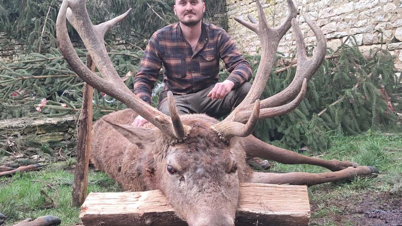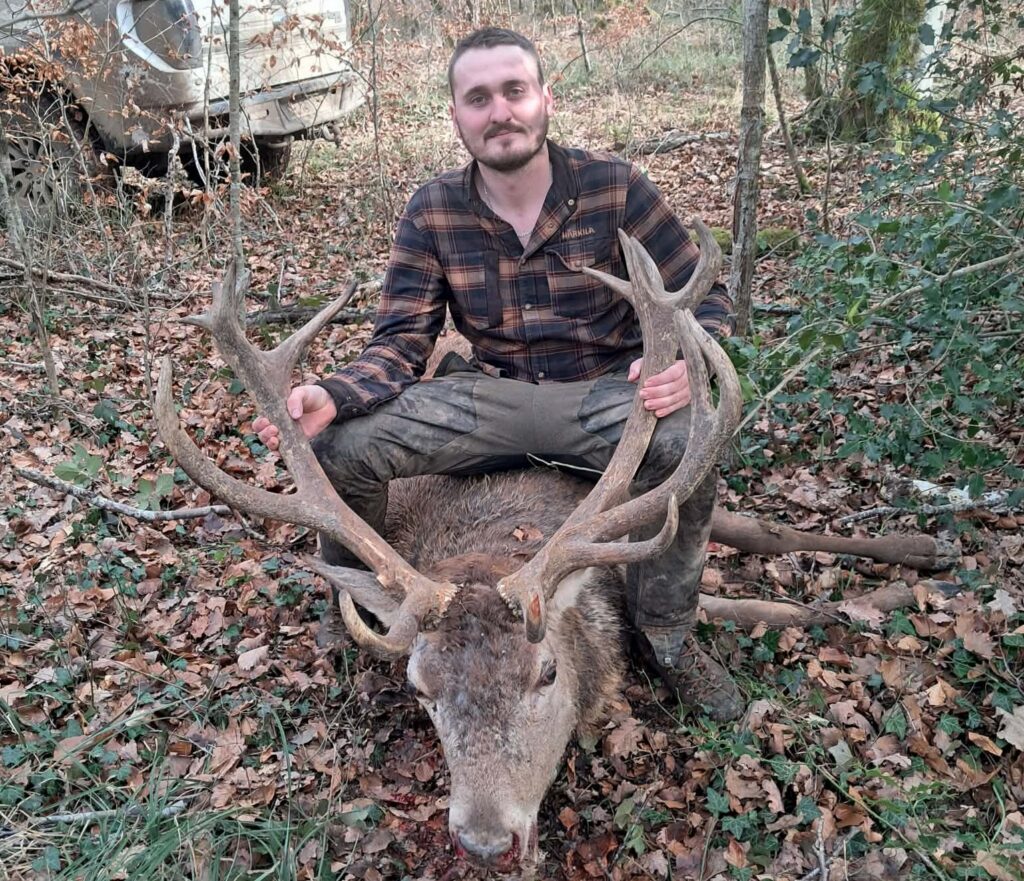 La traque débute. Vingt-cinq minutes plus tard, un voisin l’avertit qu’un grand animal vient de se lever. Quelques instants suffisent pour que le cerf se présente dans l’axe, majestueux et imposant. Corentin épaule sa Merkel RX Helix et place une balle plein cou. L’animal s’effondre sur place. En rejoignant le cerf, il mesure immédiatement l’ampleur du prélèvement. La dimension du trophée et la corpulence générale s’imposent à lui. Le cerf est massif. L’envergure des bois impressionne, mais c’est surtout le volume du corps qui marque durablement les esprits.