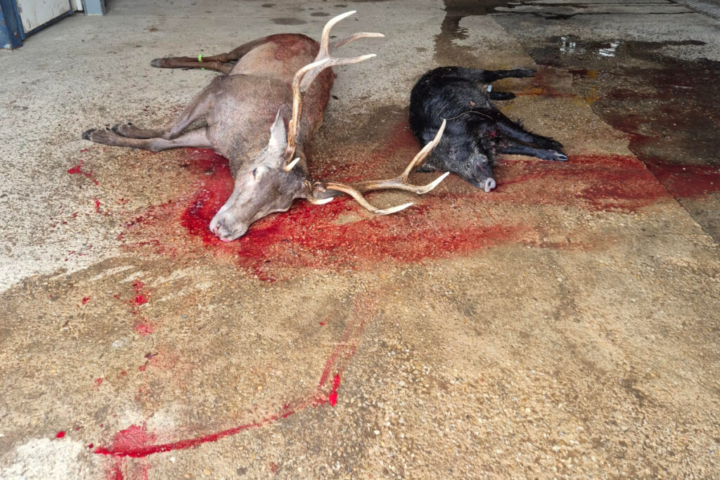 Alors que le sanglier était encore chassé par la meute, Joffrey avait bien vu une biche se dérober et passer à portée de son poste mais la distance, supérieure à 150 mètres, ne garantissant pas un tir absolument fichant, notre nemrod avait préféré la laisser passer. Mais, alors que l’annonce de la mort du sanglier retentissait par les sonneries de pibole et sur la radio, Joffrey vit arriver à travers les repousses de châtaigniers, un grand cerf majestueux. Ne cédant pas à l’excitation, notre chasseur attendit que l’animal passe la ligne à environ 60 mètres de lui et, dès l’angle de 30 degrés franchi par le cerf, un beau coup de carabine l’atteint au défaut de l’épaule. Immédiatement, le roi de la forêt s’effondra dans ses traces. Mais, on connaît la résistance de ces grands animaux, capables d’emporter sur plusieurs centaines de mètres une balle, même mortelle. Aussi, Joffrey ne prit aucun risque et voyant son grand cerf faire mine de se relever, il lui tira une balle d’achèvement en plein cou.