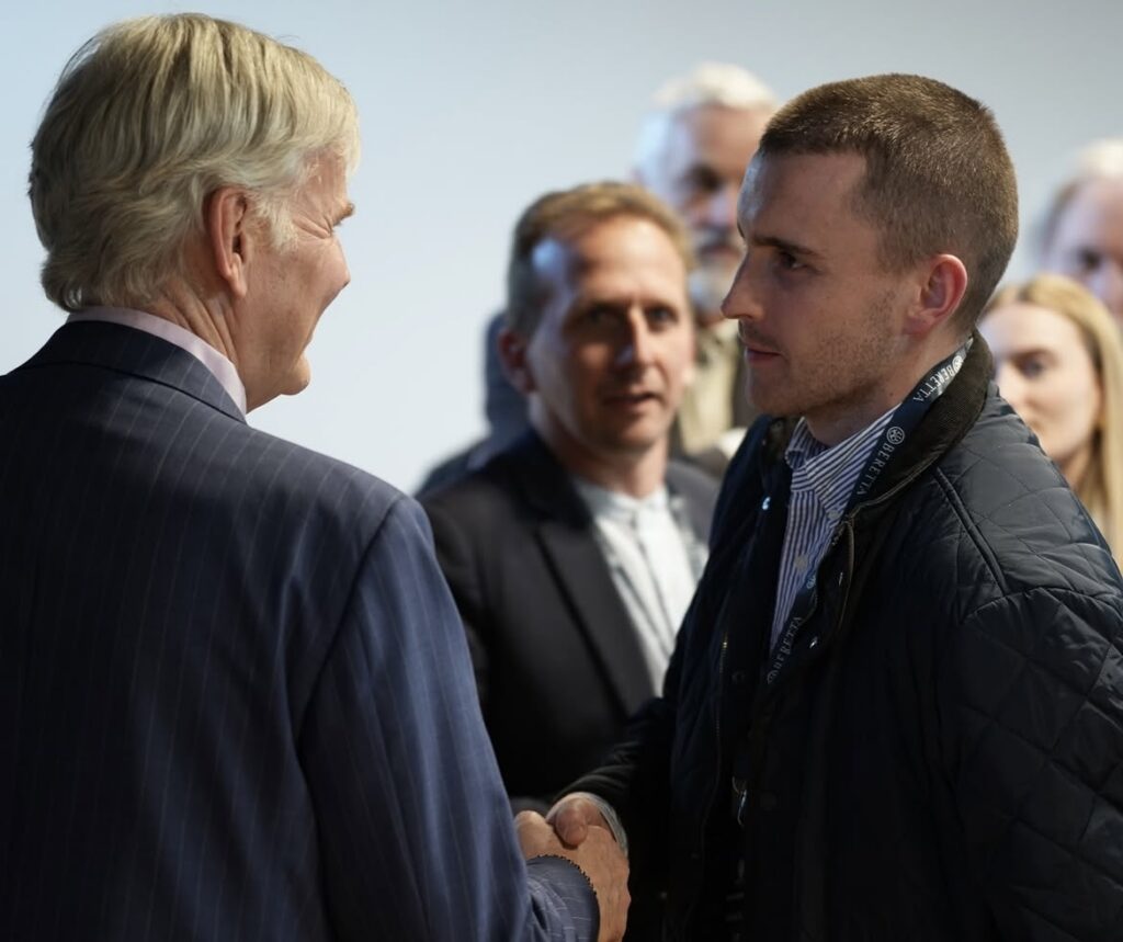 Le PDG Franco Gussalli Beretta saluant Adrien Farabolini du groupe Humbert (distributeur de Beretta en France)