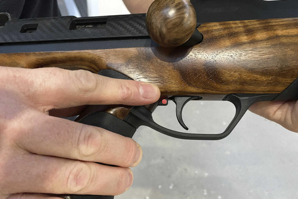 Le chargeur polymère, droit et en simple pile, s’insère derrière la poignée : 6+1 coups en calibre standard, 5+1 en magnum. La sécurité, point crucial sur ce type d’arme, a poussé Walther à innover : l’armeur est intégré directement dans la poignée à trou de pouce. Pas de levier sur la culasse ou de bouton sous le pouce, mais un poussoir à manipuler instinctivement quand on prend l’arme en main. Pression vers l’avant pour armer, retour pour désarmer, le tout sans jamais perdre la visée. Cette solution, inédite, combine sécurité, rapidité et ergonomie. On pense à la pédale de sécurité d’un Colt 1911, mais ici, tout se joue sous le protection de la crosse trou de pouce, à l’abri des chocs.
